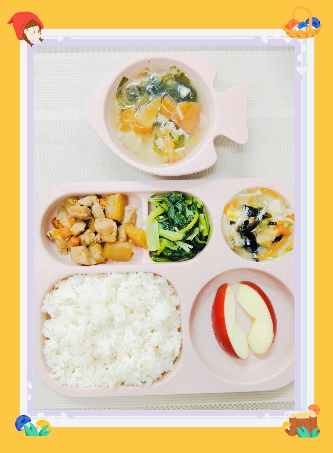 紅燒肉、什錦滷白菜、季節時蔬、蕃茄珍菇湯、水果