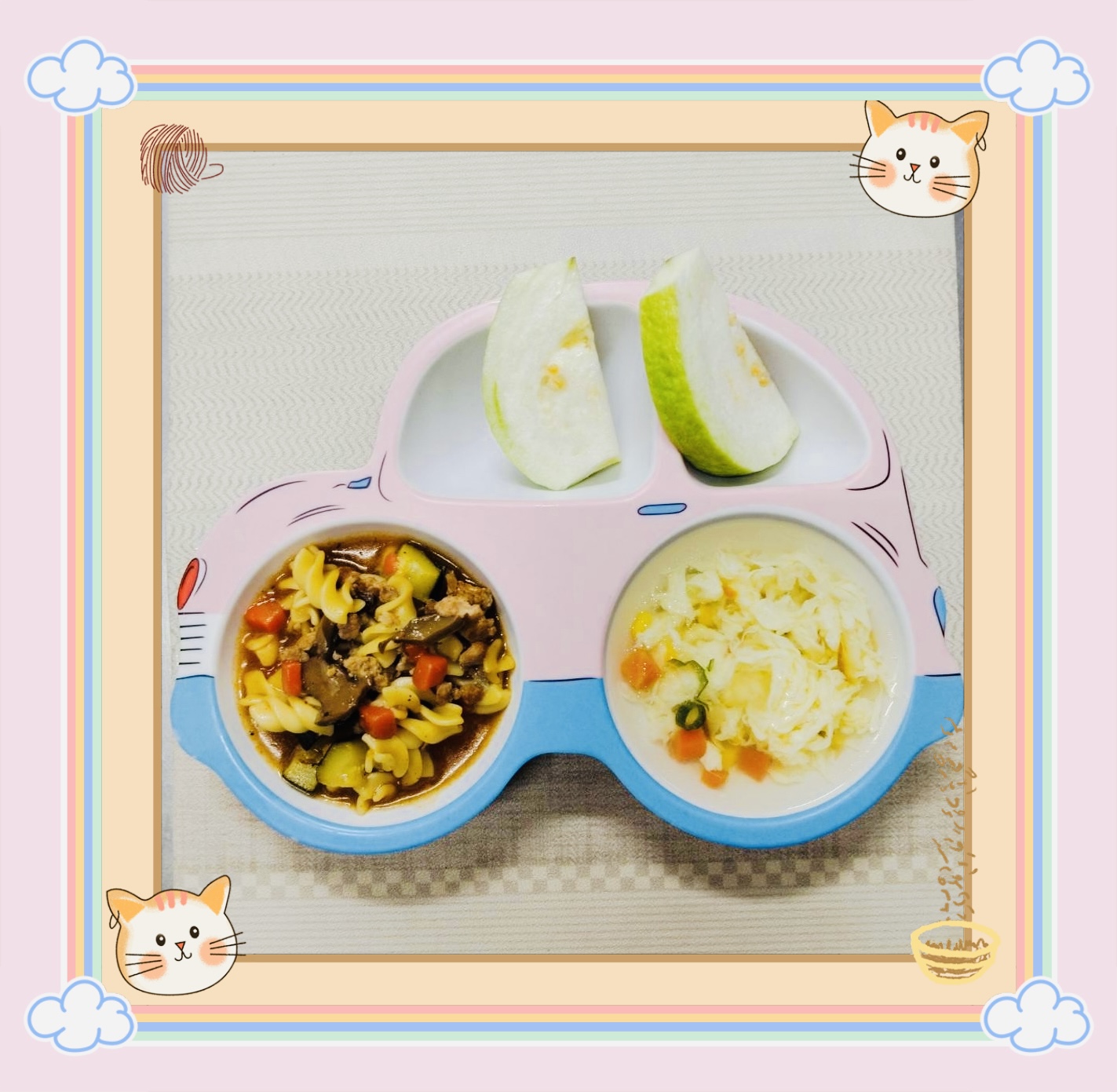 義大利肉醬麵、玉米蛋花湯、水果